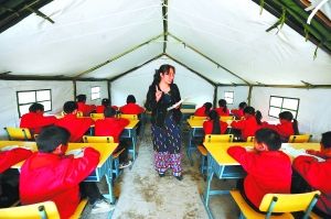 當日,云南省盈江平原鎮崗勐中心小學震后正式復課。在成都軍區某師官兵的援助下,軍用帳篷如期搭建好,四五年級的同學們坐在帳篷教室里朗朗讀書。這次地震使該學;颈粴,所有教學樓都被震成危房。幸運的是,由于平時經常進行逃生演練,學校300多名學生、老師無一受傷。新華社記者 秦晴攝