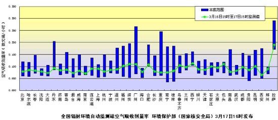 環(huán)境保護(hù)部(國(guó)家核安全局)有關(guān)負(fù)責(zé)人今日介紹說(shuō),環(huán)境保護(hù)部(國(guó)家核安全局)3月17日16時(shí)繼續(xù)發(fā)布全國(guó)省會(huì)城市和部分地級(jí)市輻射環(huán)境自動(dòng)監(jiān)測(cè)站實(shí)時(shí)連續(xù)空氣吸收劑量率監(jiān)測(cè)值。監(jiān)測(cè)結(jié)果匯總圖中綠色曲線代表監(jiān)測(cè)值,藍(lán)色柱體代表天然本底水平,綠色曲線均在藍(lán)色柱體范圍內(nèi)。監(jiān)測(cè)結(jié)果表明我國(guó)環(huán)境輻射水平未受到日本核電事故的影響。