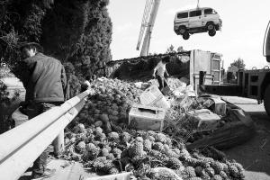 得知出了交通事故,附近不少村民跑來看熱鬧,有些村民發現出事的車上拉的是菠蘿,便打起了主意。有的村民拿著塑料袋、編織袋來到路邊,趁警察和車主不注意,把菠蘿裝進口袋;有的帶著孩子來拿,拿夠之后揚長而去;甚至有人坐在路上邊削邊吃,吃完再用衣服包上幾個離開,路邊的欄桿下全是菠蘿皮。擔心村民哄搶菠蘿,一名交警趕緊出面制止。