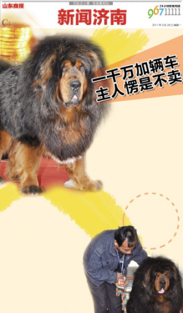 “我出1100萬再加上一輛好車,你把狗賣給我吧!薄安恍,我這藏獒大概價(jià)值2000萬呢!”近日,“2011年全國(guó)第二屆精品藏獒交易博覽會(huì)”在濟(jì)南長(zhǎng)清區(qū)濱湖大道園博園國(guó)際會(huì)展中心舉行,全國(guó)的頂級(jí)藏獒血系以及全國(guó)百?gòu)?qiáng)獒園率領(lǐng)幼獒軍團(tuán)集聚山東,其中幾條價(jià)值數(shù)千萬的藏獒,更是吸引了眾多養(yǎng)狗愛好者和普通市民的強(qiáng)烈關(guān)注。