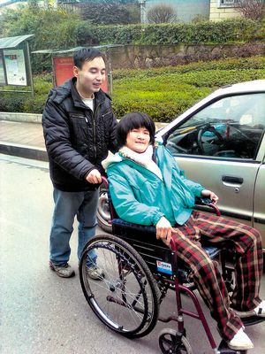“4、3、2、1,踩到平地了。”姑娘戴暉趴在小伙子胡磊背上,一級級地數著臺階,好讓他不致踩空摔倒。到了一樓,胡磊摸索著,熟練地展開彈簧輪椅,將背上的戴暉小心翼翼放在輪椅上。