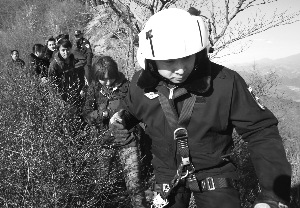 消防人員結束救援后在山下休息。前日,39名師生被困房山區貓耳山。記者 王貴彬 攝