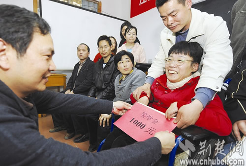 昨日,中央電大武漢分校舉行一場(chǎng)隆重而簡(jiǎn)樸的儀式。該校校長(zhǎng)為莊美鳳頒發(fā)“中央電大IET-陽光獎(jiǎng)學(xué)金”,以表彰她頑強(qiáng)的奮斗精神。