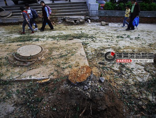 30分鐘后,一棵梧桐樹應聲倒下。它掛著嫩葉的枝干被拖上卡車,只留下一個光禿禿、高出路面不到10厘米的樹墩。