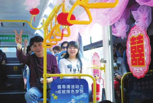在活動的出發點,4輛裝扮一新的“情緣巴士”格外亮眼。這幾輛電動空調公交車由內至外都進行了精心裝扮:車外貼上了幾個大紅喜字裝點車身,車內用粉色絲綢扎成的花球布置著。宣布活動開始后,單身男女分批登上“情緣巴士”。上車時,他們向投幣箱中放入一份“愛情宣言”,一段尋愛旅程隨即展開。