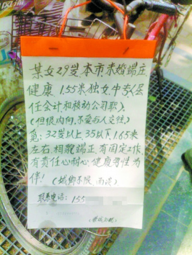 兒女的婚事一直是父母心中的大事。當今,“剩男剩女”與日俱增,“男大不婚、女大不嫁”的現(xiàn)象越來越普遍,令不少家長愁眉不展,無奈之中他們只好親自上陣。在鄭州嵩山路上的一個小游園內(nèi),每逢周末,由父母們自發(fā)組成的相親會就會熱鬧開場。隨著相親會上人數(shù)越來越多,父母開出的條件也越來越高:男要錢女要貌、高學(xué)歷、好工作,樣樣不能少,更有心急的家長虛報子女條件。一些年輕人對父母的這種做法表示理解,但難免覺得“有點煩”,希望父母能尊重兒女的意見。