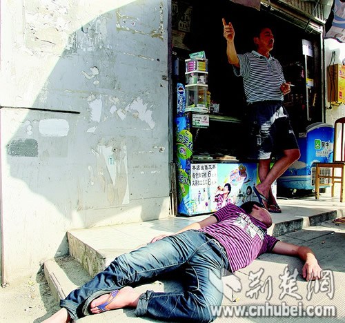 昨日(27日),一名小伙在武昌珞獅北路一副食店門口酣睡3小時,因為他在網吧通宵上網,實在是太困了。