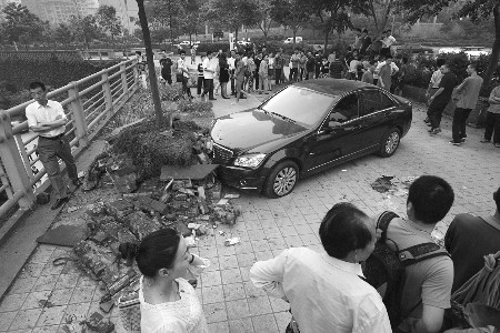 記者趕到現場時看到,一輛棗紅色的奔馳200轎車停靠在新竹路路口的人行道上,警方已在現場拉起警戒線,一名交巡警正在對現場進行勘察。轎車抵在一棵行道樹下的堡坎上,車頭已經嚴重變形,堡坎的一半已被撞垮,碎石塊散落一地。在轎車的左側車門邊,一攤鮮紅的血跡依然清晰可見。而路邊約1米高的花臺里的植物,順著人行道一側的方向倒下了一片。一名約20多歲的年輕女子在車邊不停地哭泣。這名身穿連衣裙、著平底鞋、長相漂亮的女子承認,奔馳車就是她駕駛的。