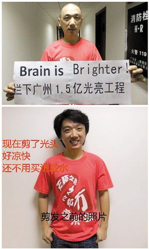 “征集光頭,照亮廣州”,27日凌晨1時許,一位網(wǎng)名“brainisbrighter”的廣州仔發(fā)表了一篇題為《征集廣州市民剪光頭照亮廣州,攔下1.5億光亮工程》的博文,同時貼出自己削發(fā)過程等照片,并在新浪微博轉(zhuǎn)發(fā),引來眾多網(wǎng)民熱議。