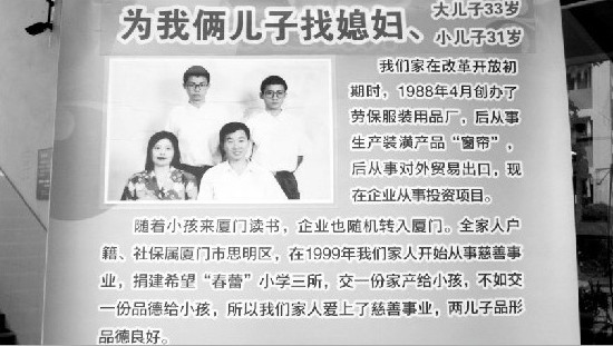 他直接在廈大海韻公寓的食堂門(mén)口豎起了征婚廣告牌,還把兒子的個(gè)人資料放在一邊,像傳單一樣供人取閱?梢(jiàn),秦老伯的心情是何等焦慮!