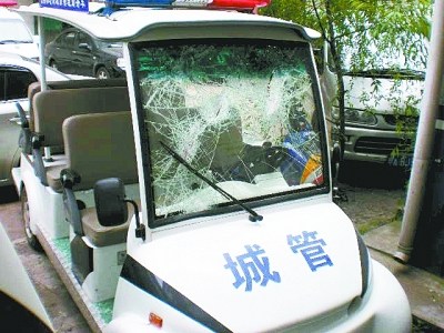 圖為被砸壞的城管執法車。記者 蔡曉智 攝