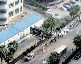 這張圖片顯示,到一個路口,送葬人員就拉開白布條攔路。