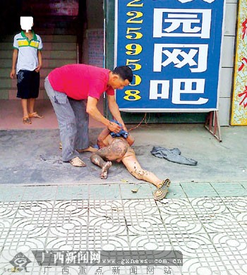 近日,在河池某網站論壇上一組題為“虐待兒童”的照片引起強烈關注:一名男子當街將一個男孩扒得一絲不掛,男孩倒在地上,滿身泥污,男子則拽著他的腿暴打他。5月5日,記者幾經周折找到了照片中的男子和男孩,發現他們是一對父子。10歲的小萌(化名)偷錢去上網,父親覃某發現后,一時氣憤,做出了過激舉動。他對記者述說著與網絡爭奪兒子的艱難和苦惱,數次落淚。