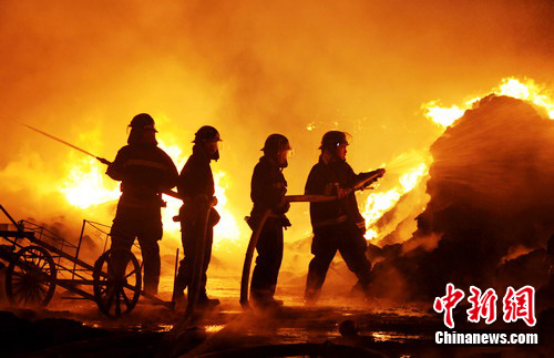 4時25分,消防官兵到達現場時,火勢已處于猛烈燃燒階段。刺鼻嗆人的滾滾黑煙沖天而起,廠區(qū)內的原材料在大火的包圍中熊熊燃燒,如果火勢得不到有效控制,與之相隔的廠房和附近居民區(qū)必將遭受火魔吞噬,有可能造成“火燒連營”的局面,后果將不堪設想。