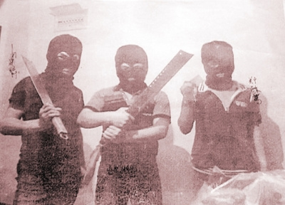 在嫌疑人手機中,民警還發(fā)現(xiàn)了幾張照片。照片中,幾名嫌疑人戴著頭套、手持砍刀,一副“威風凜凜”的樣子。據(jù)嫌疑人交代,照片拍攝于他們策劃作案之前、完成分工以后,“全副武裝”后,他們一起合影,準備日后做個紀念。