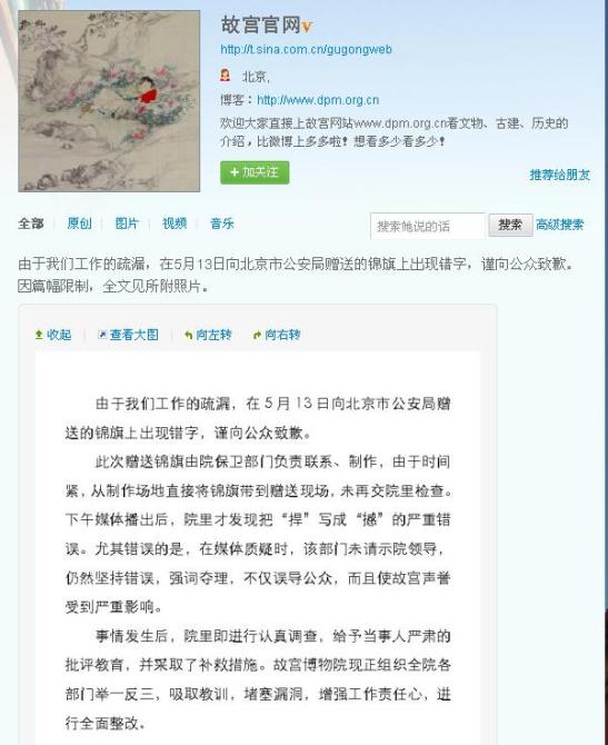 故宮博物院16日通過微博就其向北京市公安局贈(zèng)送錦旗出現(xiàn)錯(cuò)字一事,向公眾道歉。故宮在這份聲明中說,此次贈(zèng)送錦旗由保衛(wèi)部門負(fù)責(zé)聯(lián)系、制作,贈(zèng)送前未“交院里檢查”。在媒體質(zhì)疑時(shí),該部門未請示院領(lǐng)導(dǎo),仍然堅(jiān)持錯(cuò)誤,強(qiáng)詞奪理,不僅誤導(dǎo)公眾,而且使故宮聲譽(yù)受到嚴(yán)重影響。