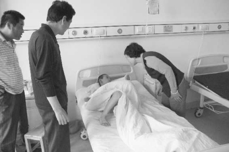王宗來(左二)與妻子孫成鳳(右一)到醫(yī)院看望小浩然。