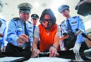 昨日,東城區(qū)法院,高曉松在處罰決定書上簽字。當(dāng)日,東城區(qū)交通支隊(duì)前往法院,對高曉松宣讀吊銷駕照并處罰1000元的行政處罰決定書。高曉松表示沒有意見。今日下午,高曉松醉駕案將開審。記者 楊杰 攝