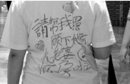 網友“cinya”的原帖為:姐去逛商場,無意間巧遇一件極滑稽又感動的事,一個穿白色T恤的孕婦,衣服背后一行手寫紅字:“請幫我照顧下,我老婆懷孕了。”文字的間隙,還配有幾個紅色的愛心,看上去也是手繪而成。