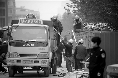 工人在現(xiàn)場(chǎng)清理廢墟。