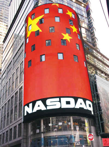 美國·紐約:紐約時報廣場納斯達克電子顯示屏上循環顯示中國五星紅旗,慶祝中國龍年。 新華社記者 王成云攝