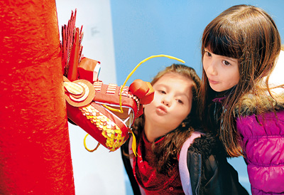 美國·華盛頓:華人居住集中的羅克維爾縣舉行慶祝中國農歷新年活動。6歲半的哈娜·弗蘭克(左)和7歲的勞倫·波維奇與一個中國龍的裝飾親密合影。 新華社記者 王軼歐攝