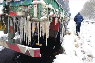 前晚7時(shí),近兩千人被困在八達(dá)嶺高速出京居庸關(guān)到水關(guān)長(zhǎng)城段。風(fēng)雪撲向車(chē)窗,大車(chē)司機(jī)李福海把車(chē)停在應(yīng)急車(chē)道,打開(kāi)雙閃熄了火。他跟副駕駛小孫說(shuō),用不了多長(zhǎng)時(shí)間就能走。一個(gè)多小時(shí)過(guò)去,當(dāng)他想再次啟動(dòng)車(chē)輛,雨刷已經(jīng)推不動(dòng)前擋風(fēng)的積雪了。