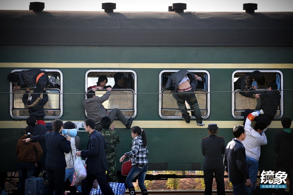 2016年春運(yùn)已經(jīng)拉開大幕。作為人類史上規(guī)模最大的、周期性的大遷徙,春運(yùn)在短短的十?dāng)?shù)日內(nèi)的旅客發(fā)送量高達(dá)數(shù)十億人次。在此期間,許許多多的人們經(jīng)歷千辛萬苦,穿過大半個中國回家過年。而每當(dāng)此時,隨著歸鄉(xiāng)的游子們紛紛匯入春運(yùn)大潮,一幕幕的人在“囧”途也隨之上演。圖為2009年1月12日,惠州火車站,來不及上車的旅客,拉的拉,扶的扶,從車窗爬進(jìn)車廂。圖片來源:央視網(wǎng)