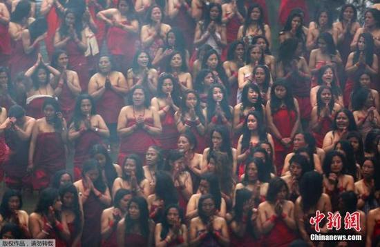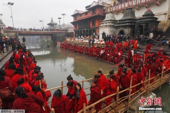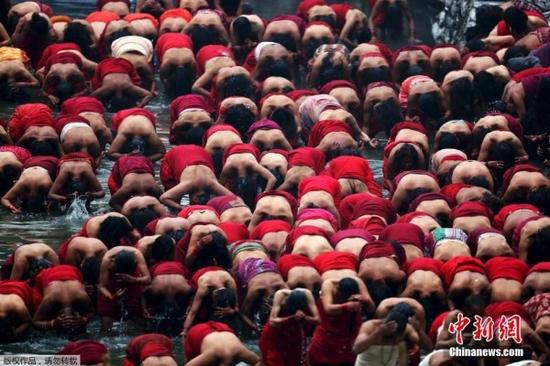 當地時間2016年2月9日,尼泊爾加德滿都,印度教徒在斯瓦斯塔尼節期間洗圣浴。斯瓦斯塔尼節是為期一個月的印度教節日,供奉印度教女神斯瓦斯塔尼。印度教婦女在巴格馬提河祈禱、齋戒,許多已婚印度教婦女認為,這能為她的丈夫及家人帶來幸福,而未婚的女性則祈求讓她們找到好的歸宿。