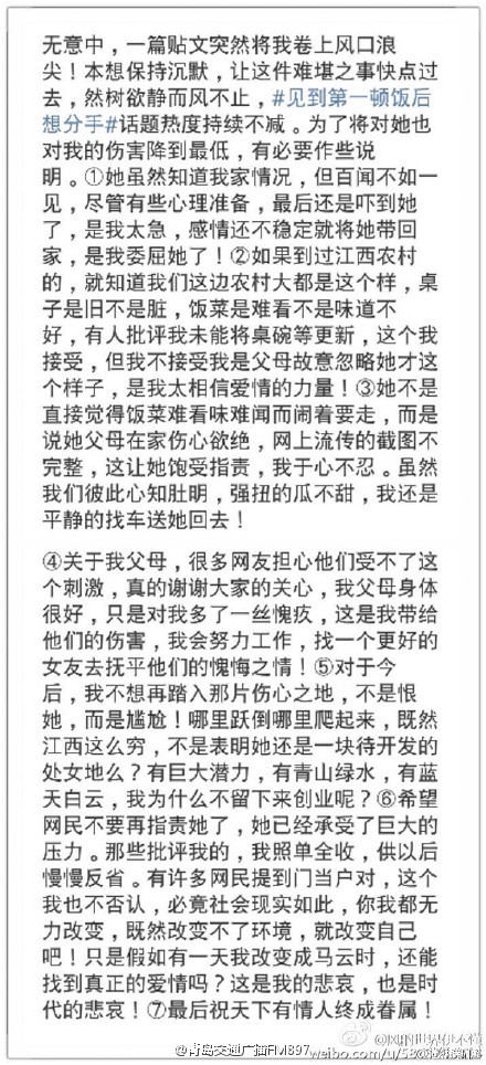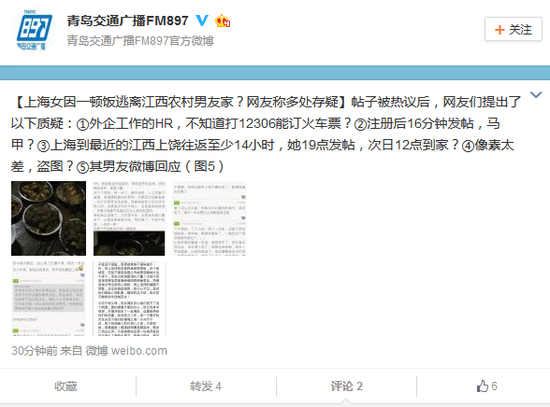 [上海女因一頓飯?zhí)与x江西農(nóng)村男友家?網(wǎng)友稱多處存疑]帖子被熱議后,網(wǎng)友們提出了以下質(zhì)疑:①外企工作的HR,不知道打12306能訂火車票?②注冊后16分鐘發(fā)帖,馬甲?③上海到最近的江西上饒往返至少14小時,她19點發(fā)帖,次日12點到家?④像素太差,盜圖?⑤其男友微博回應(yīng)(圖2)