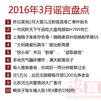 人民網(wǎng)北京4月7日電(記者孝金波 實(shí)習(xí)生韓亞云)3月,山東疫苗事件備受關(guān)注,衍生謠言隨之?dāng)U散;“充氣蹦床爆炸”等熱點(diǎn)事件被移花接木夸張傳播;“吃大盤雞感染禽流感”、“搶孩子”等舊謠改頭換面卷土重來……“求真”欄目對3月謠言進(jìn)行盤點(diǎn)梳理,推出“盤點(diǎn)3月十大假新聞”榜單。