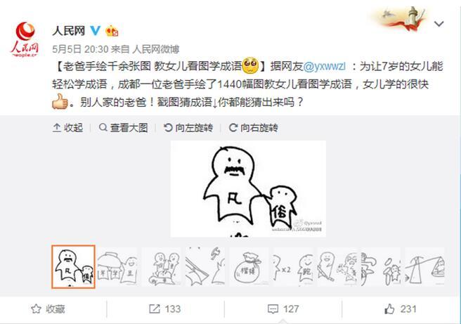 四川新聞網成都5月9日訊(記者 陳淋)愚公移山、凡夫俗子、紛至沓來、踉踉蹌蹌、稱王稱霸……當這些成語變成有趣的漫畫形式,是不是很有趣?讓人一下就記住了。近日,成都便有這樣一位巧手爸爸,為了教7歲女兒學成語,自己手繪了1440幅漫畫,它的漫畫作品被朋友上傳到微博后,隨即被人民網、鳳凰網、四川新聞網、揚子晚報、重慶日報等多個官方微博轉載,引發網友熱烈討論,并掀起一輪猜成語熱潮。這位爸爸儼然已成為新一代“網紅”,他也被網友親切地稱為“漫畫爸爸”。