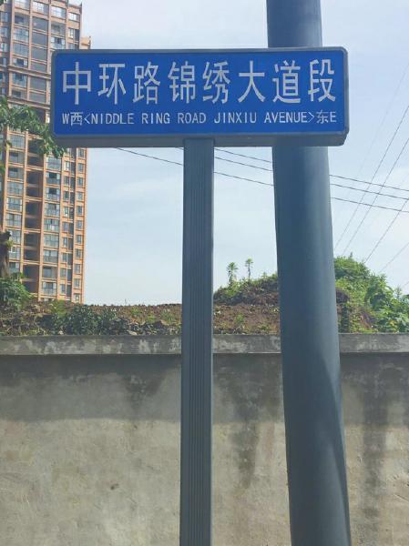 路牌就立在路口的人行道上,藍(lán)底白字,寫著“中環(huán)路錦繡大道段”,中文下面,還有英文翻譯,字號稍小,寫著“NIDDLE RING ROAD JINXIU AVENUE”。“我查了,根本沒有‘NIDDLE’這個詞,應(yīng)該是‘MIDDLE’吧,中間的意思。”