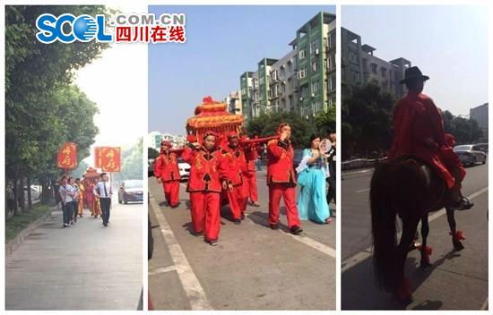 四川在線眉山頻道訊(記者袁洋)“我一定會用八抬大橋來娶你!”5月10日,眉山新郎官冉先生對他的新娘兌現了諾言。今天一早,冉先生騎著黑色駿馬,帶著八抬大轎和10多人的迎親隊伍,帥氣地從眉山城區東湖麗景小區出發,到森林半島小區贏娶他的新娘。