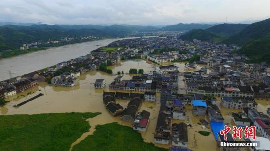 6月19日8時至20日4時,受氣象因素影響,湖南龍山縣中、北部區域出現強降雨過程。以出土大量秦簡名揚海內外的龍山縣里耶古鎮堤防于20日15時許發生漫潰。此次強降雨共造成龍山縣12個鄉鎮92村4.87萬人受災,緊急轉移人口0.323萬人,房屋受損48間,直接經濟損失7300余萬元。目前沒有人員傷亡。圖為航拍龍山里耶水災。 陳宇馳 攝