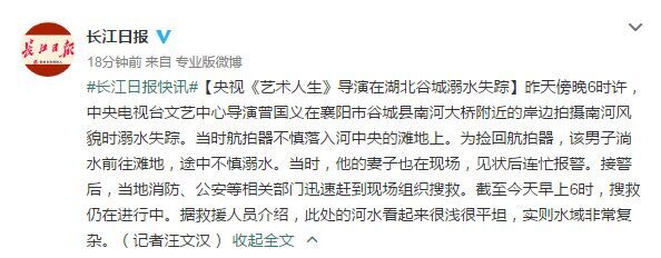 據長江日報官方微博報道,昨日(6月22日)傍晚6時許,中央電視臺文藝中心導演曾國義在襄陽市谷城縣南河大橋附近的岸邊拍攝南河風貌時溺水失蹤。當時航拍器不慎落入河中央的灘地上。為撿回航拍器,該男子淌水前往灘地,途中不慎溺水。當時,他的妻子也在現場,見狀后連忙報警。接警后,當地消防、公安等相關部門迅速趕到現場組織搜救。截至今天早上6時,搜救仍在進行中。據救援人員介紹,此處的河水看起來很淺很平坦,實則水域非常復雜。