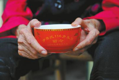 7月9日是老人116周歲生日,她的兒媳、孫子、曾孫和玄孫等共17名直系后代,五代同堂一起為她祝壽。院壩里,重孫子開車回家,車上載著訂做的116歲大壽紅瓷碗,瓷碗上的樹木雕文,花紅葉綠,碗有上百個,重孫子在一件件往屋里搬。屋檐下,羅齊氏老人端坐在藤椅上,口中依舊含著一顆冰糖,看著兒孫滿堂、嬉笑打罵,冰糖慢慢融化,甜意融入內心,融入時空。