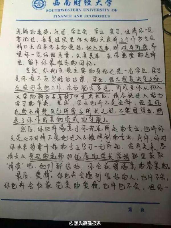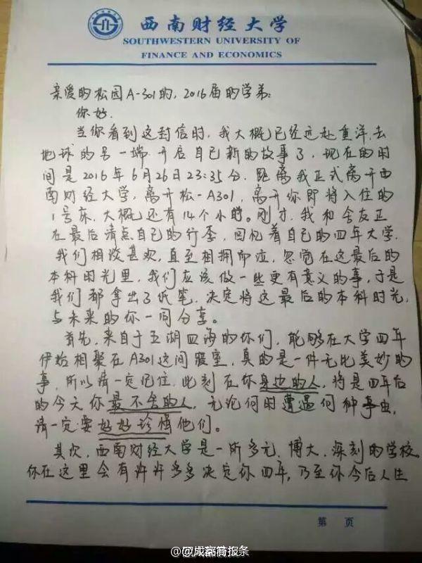 未見(jiàn)卻真情!畢業(yè)學(xué)長(zhǎng)給未來(lái)同寢學(xué)弟留“內(nèi)心獨(dú)白”】西南財(cái)經(jīng)大學(xué)的劉陽(yáng),在畢業(yè)離校前夜,給未來(lái)入住寢室的學(xué)弟留下一封信:“此刻在你身邊的人,將是4年后的今天你最不舍的人”“對(duì)于愛(ài)情,即使是痛苦也會(huì)令你有所收獲”…學(xué)弟看到會(huì)不會(huì)滿(mǎn)滿(mǎn)感動(dòng)?via四川高校頭條