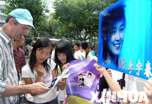 2005年超女比賽期間,李宇春粉絲手持宣傳海報,請路人用手機為偶像投票。 來源:新華社 朱丹陽攝