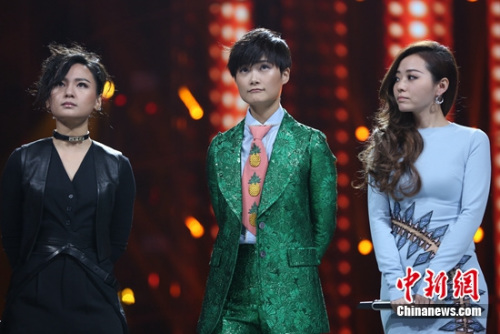 湖南衛視2015-2016跨年演唱會上,05屆超女“三甲”周筆暢、李宇春、張靚穎合體亮相 來源:主辦方供圖