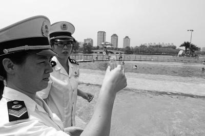 7月6日,北京市衛(wèi)生監(jiān)督所檢查人員來到朝陽區(qū)朝陽公園檢查露天游泳池水質(zhì)。