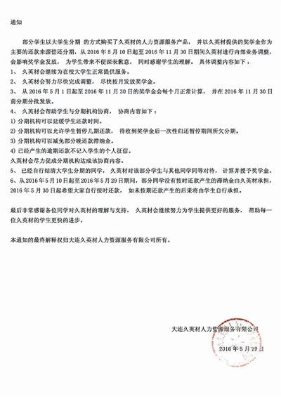 經過多番協商,當晚久英材給出了一份書面通知。這份蓋有久英材公章的通知顯示,久英材承認學生“以大學生分期的方式購買了久英材的服務產品,并以久英材提供的獎學金作為主要的還款來源償還分期”。久英材表示,11月30日之前,由于公司進行內部業務調整,導致獎學金無法正常發放。久英材承諾,在此期間會和分期機構協商,允許學生暫停幾期還款。