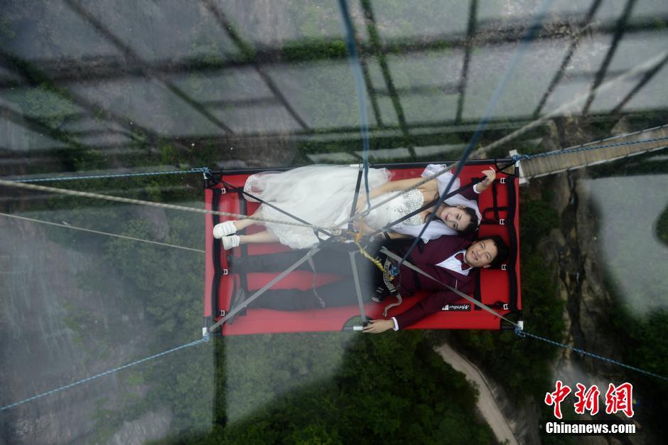 8月9日,正值“七夕”中國情人節(jié)。當(dāng)日,一對“90后”夫妻在湖南平江石牛寨玻璃橋舉行了一場特殊的高空極限婚禮,以此特殊方式紀(jì)念自己的新婚。圖為“90后”夫妻在吊帳上“秀恩愛”。楊華峰 攝