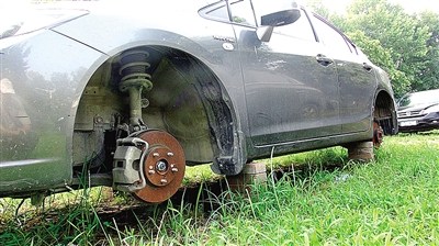 昨日上午,記者來到本田車停放現場。該車四周停放有上百輛轎車,唯獨本田轎車4個輪胎連輪轂全部被卸走,只留下已經是銹跡斑斑的剎車轂。車輪旁邊平整地支起5塊紅磚。車底雜草叢生,車身四周滿是塵土,由此推斷,車輪被卸已經有很長時間了。