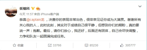 在決賽輸給馬龍沒多久,北京時間12日中午,張繼科在微博上首先恭喜馬龍奪金,“決賽你的表現非常出色,很榮幸見證你成為大滿貫。”然后表示,“對于成績自己很平靜,但想到你們的期盼,真的要說一聲:抱歉。”最后,張繼科讓大家放心,他很好,正在為團體賽作調整,力爭和隊友一起圓滿完成任務。