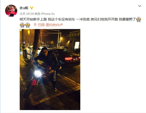 乒乓球團體的比賽即將開始,中國選手許昕已經迫不及待了。在微博曬出一張騎車的照片,宣告新手要上路了,“明天開始新手上路,我這個車沒有剎車,一沖到底,弟兄們給我開開路,我要撒野了!”