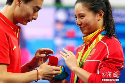 當(dāng)?shù)貢r間8月14日,2016里約奧運(yùn)女子三米板決賽賽后,中國跳水運(yùn)動員秦凱向剛剛獲得銀牌的何姿求婚。中新網(wǎng)記者 富田 攝