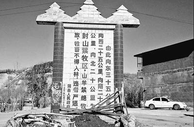 走臨大公路到蒲縣,路邊能看到一處告示碑,白底紅字,上面寫著幾行大字,“由此向東三十五公里,向西二十五公里,向南二十五公里,向北二十公里為封山禁牧區,山羊禁絕牧放,牲畜不得入林,違者嚴懲。”落款是“蒲縣人民政府 二〇〇〇年九月二十八日”。