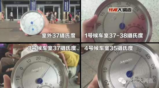 隨后記者又來到3號候車室。這里的溫度僅僅比室外溫度僅僅低了一度。4號候車室的室內溫度是35°,與室外溫度也相差無幾。