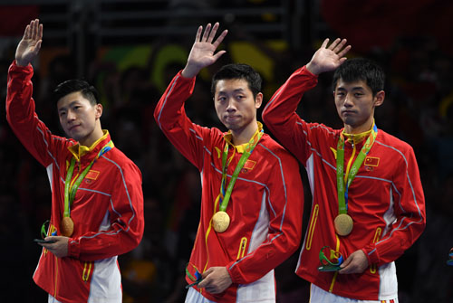 在2016年里約奧運會乒乓球男子團體賽決賽中,中國隊以3比1戰(zhàn)勝日本隊獲得金牌。 新華社記者 殷博古 攝